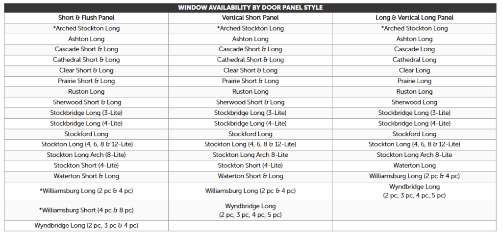 Wayne Dalton offers an incredible selection of window panels. Choose from 31 window options for Short and Flush Panels options, 29 choices for Vertical Short Panel, and 22 options for our Long and Vertical Long Panels. Whether you envision your Classic Steel garage doors with arched toppers, a tidy row of panes up high, we’re here to help you bring your vision to life—and light!
