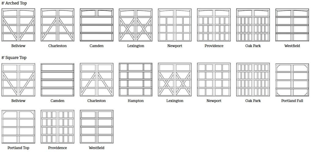 Optional insulated glass available for improved thermal performance. Window patterns are shown for a typical single-car door. Spacing of windows may change depending on door size. Not all windows available on all door sizes.